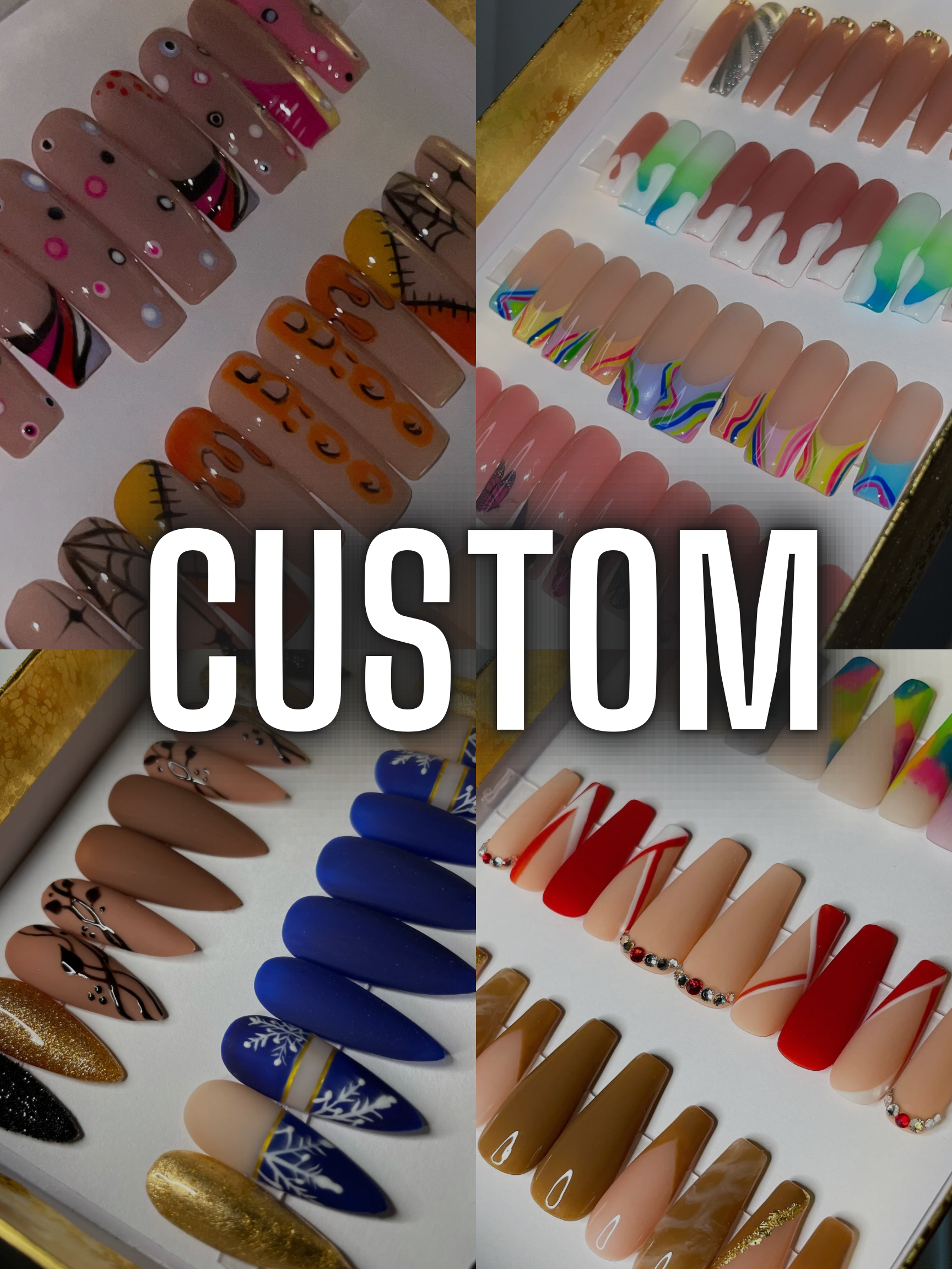DISCLAIMER: Please, if you get a custom order, I will try my best to replicate/an idea the nails you want in the photo. It will NOT be exact since I do NOT take people’s work. Do NOT expect anything more than I can already do. I do NOT use acrylic, I only use gel top polished only. Thank you for your understanding!
